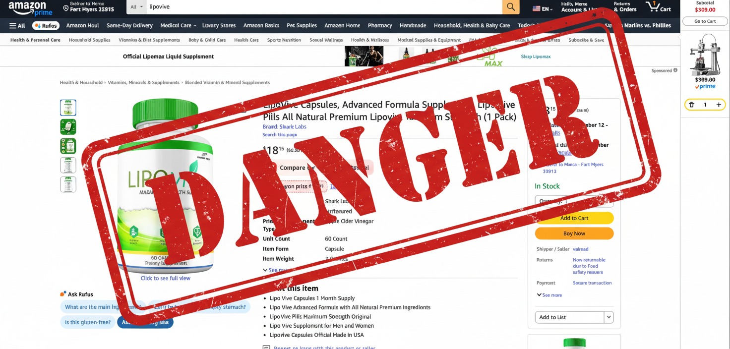 We strongly advise against ordering LipoVive from Amazon, Walmart, eBay or Walgreens, as these sources often sell fake versions with entirely different ingredients, which can be very dangerous.